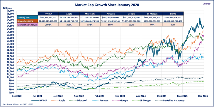 3. Nvidia (and the other 6): In January of 2020 amidst the COVID pandemic, Nvidia had a market capitalization of $150 billion. Very few outside of the technology or investment landscape had even heard of the company. Today, companies valued around $150 billion include Capital One, Boeing, Pfizer and Adobe, generally considered household names. As of December 9, 2025, Nvidia has a market capitalization of $4.5 trillion and is the largest publicly listed company in the world. It has led a group of large companies affectionately known as the Magnificent 7 (“mag 7”), including Alphabet (the parent company of Google), Apple, Microsoft, Meta (the parent company of Facebook and Instagram), and Tesla. Nvidia didn’t exactly come out of nowhere, but its semiconductor chips have now become essential to the ongoing AI boom. As of the end of November, these companies represent roughly 35% of the S&P 500. Naturally, how they perform can impact broader market returns. Nvidia alone accounts for just under 8% of the index. In other words, if these companies continue to grow and do well, markets could react favorably, and vice versa. Their size alone (in excess of $1 trillion, which was believed to be an almost unattainable benchmark not too long ago) makes them worth attention in 2026.